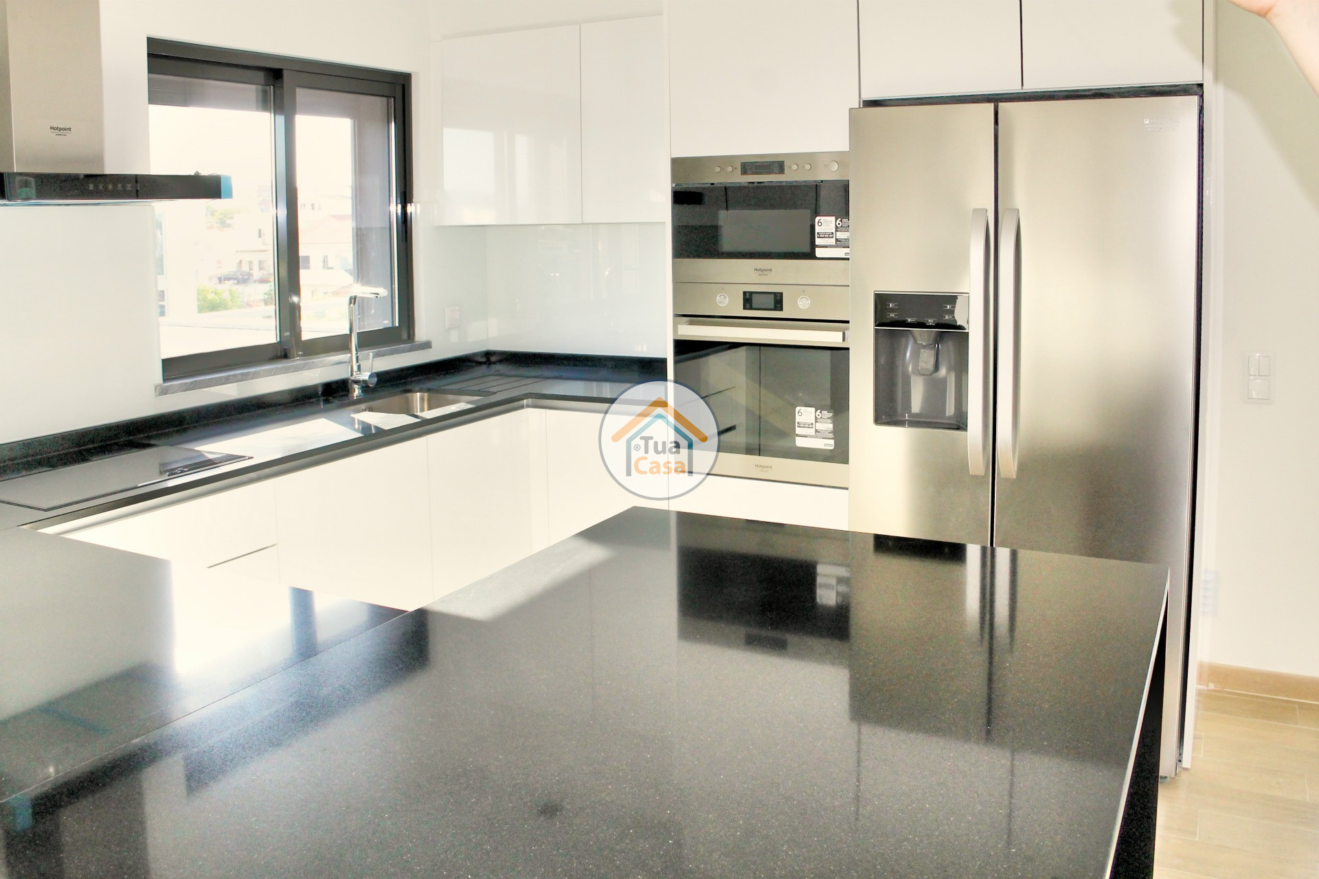La cuisine est équipée d'un équipement Whirlpool. La cuisine est équipée avec des meubles, induction noire, lave-vaisselle et mixeur, hotte aspirante en acier inoxydable, colonne du four, réfrigérateur américain en acier inoxydable et lave-vaisselle entièrement intégré. La buanderie avec machine à laver de couleur blanche.